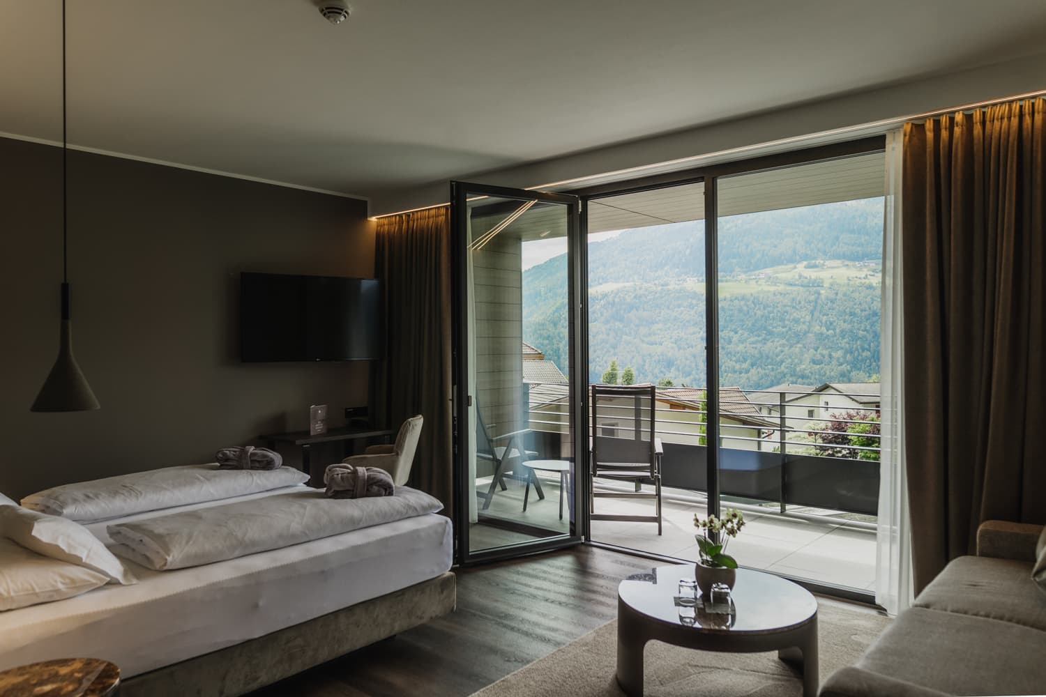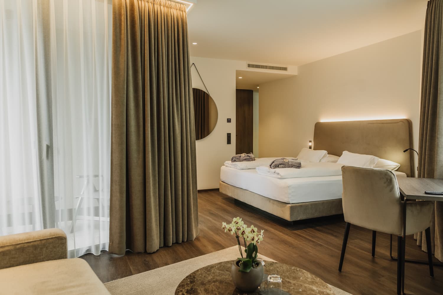 Nach einem Tag voller Wanderungen, Radtouren oder Golfrunden kehren Sie zurück in komfortable Zimmer und großzügige Suiten. Natürliche Materialien, moderner Komfort und herrliche Ausblicke auf die Südtiroler Bergwelt – der perfekte Ort zum Entspannen und Kraft tanken.