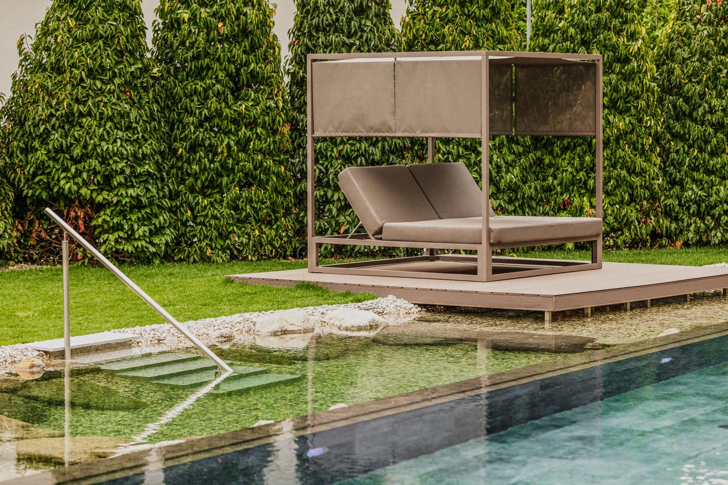 Unser 1.000m² großer Wellness Vital Garden umfasst: Infinity Pool mit 32°C Salzwasser, beheiztes Hallenbad, beheizter Außenpool, 3 Saunen (Finnische Sauna, Bio Kräuter Sauna, Dampfbad), Whirlpool, Panorama-Terrasse mit Rundumblick auf die Berge, Infrarotliegen und Naturteich. Die Saunalandschaft ist Adults only (ab 16 Jahren).